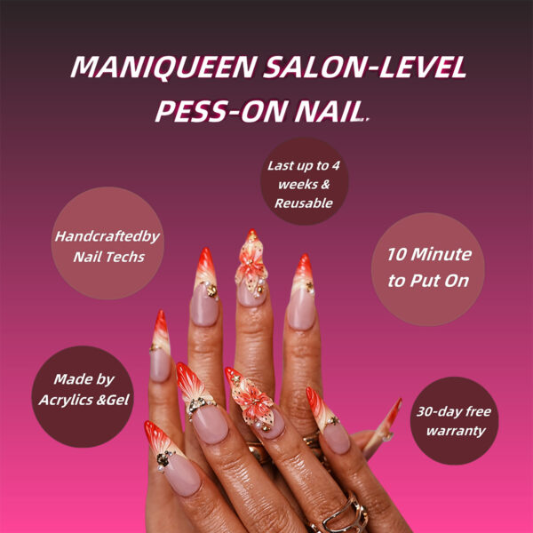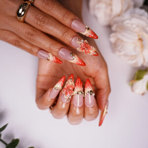 + Free Shipping“Coral Majesty” nail art combines a soft nude – to – coral gradient with 3D floral details and golden, pearl – like adornments. It creates a luxurious and graceful look, evoking the beauty and charm of coral reefs, perfect for those who desire a sophisticated and ocean – inspired nail style.