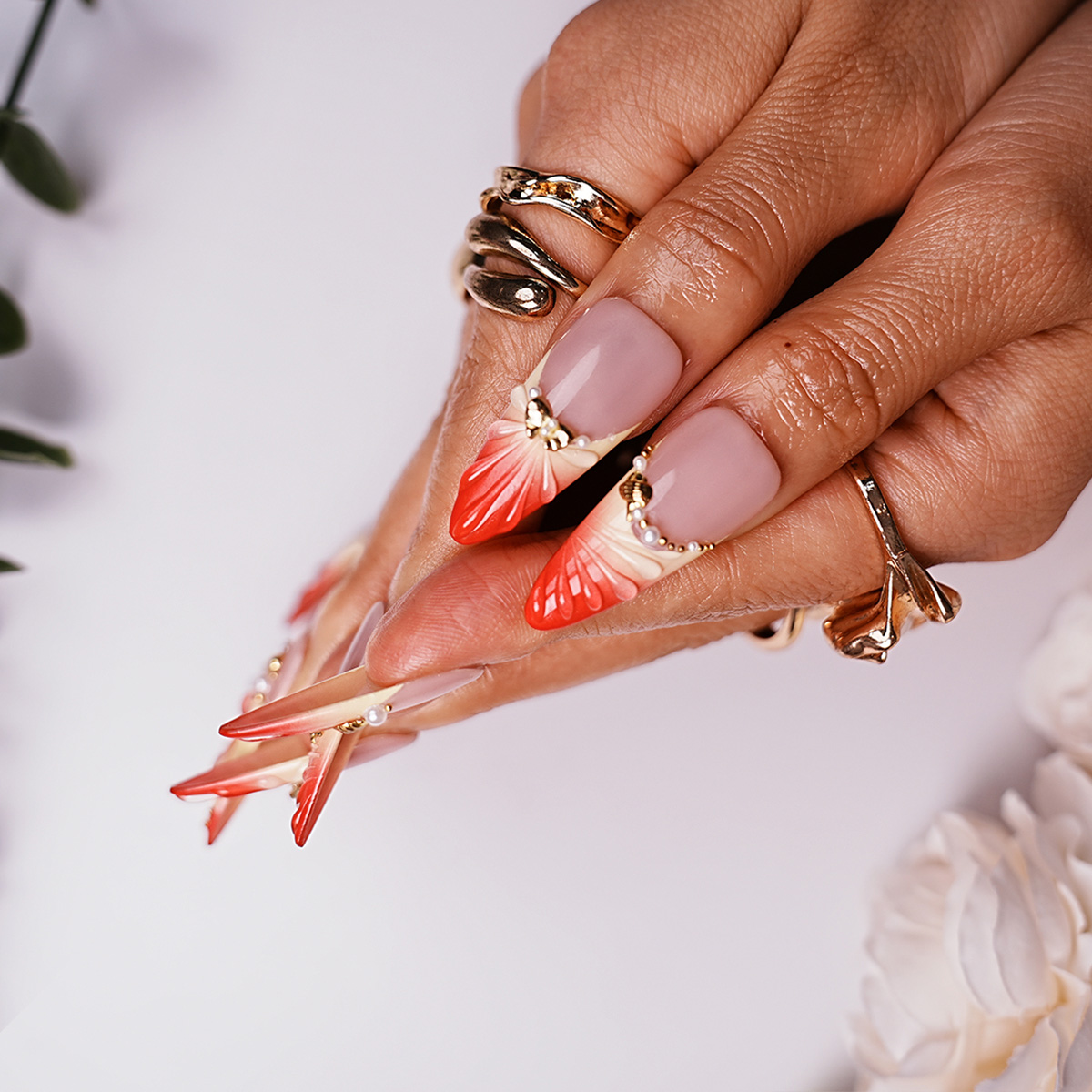+ Free Shipping“Coral Majesty” nail art combines a soft nude – to – coral gradient with 3D floral details and golden, pearl – like adornments. It creates a luxurious and graceful look, evoking the beauty and charm of coral reefs, perfect for those who desire a sophisticated and ocean – inspired nail style.