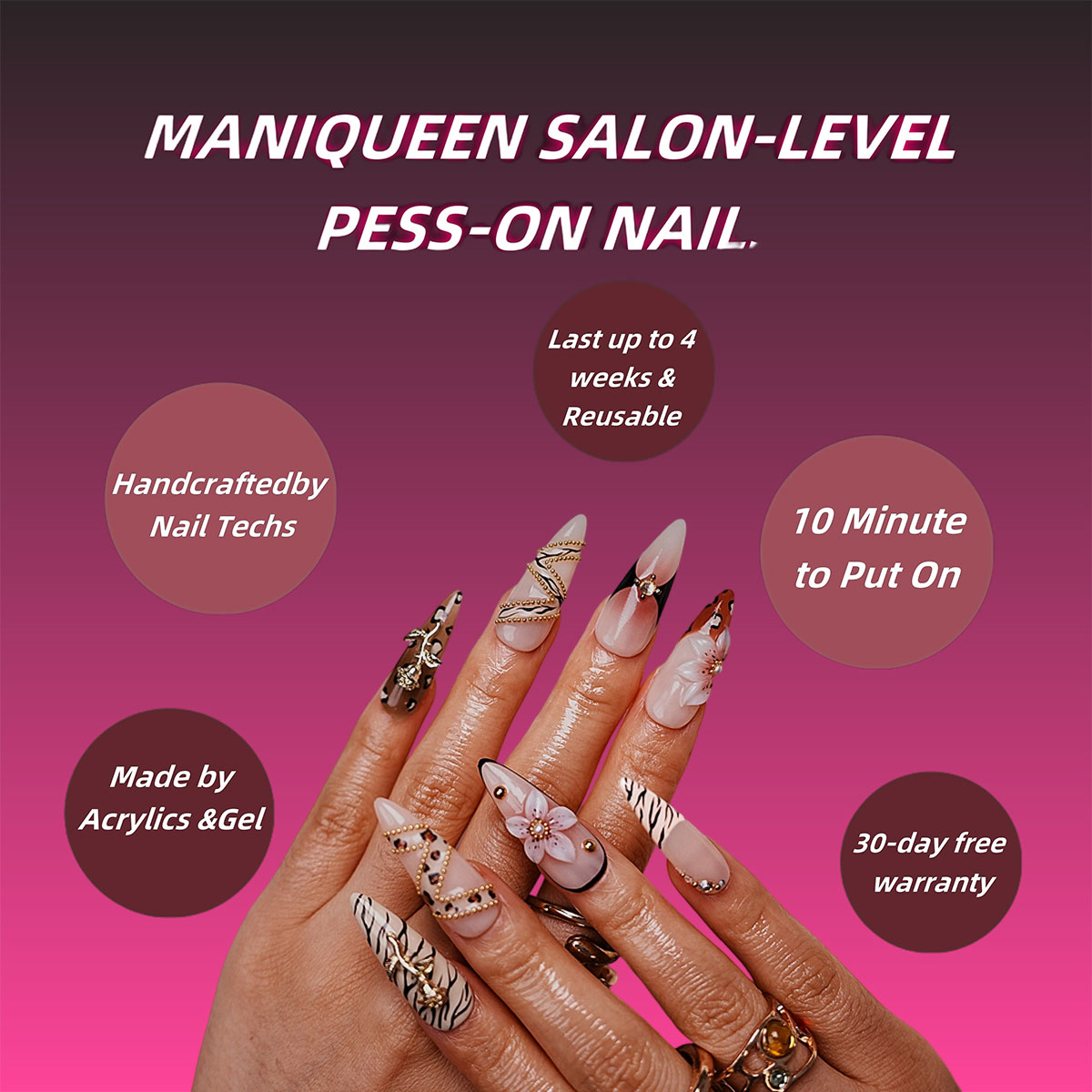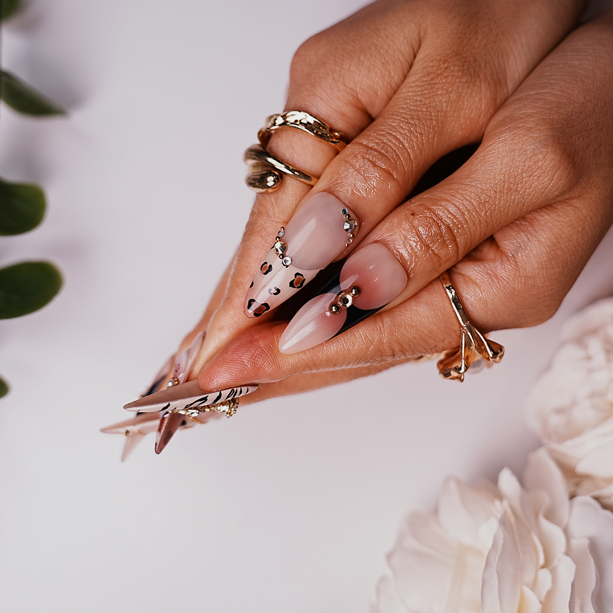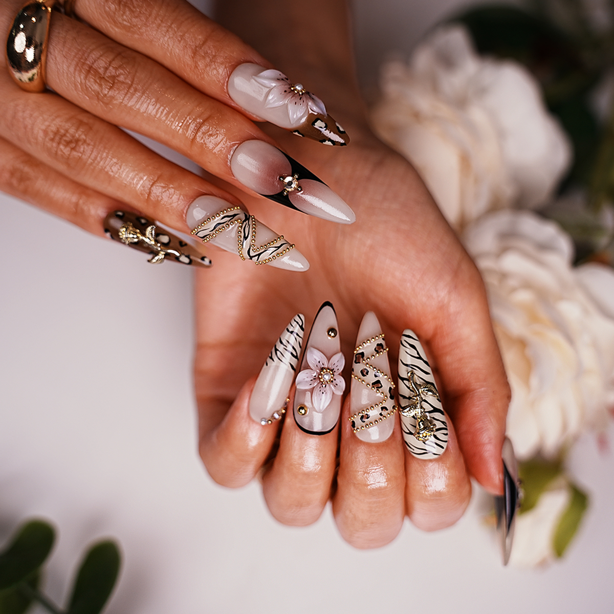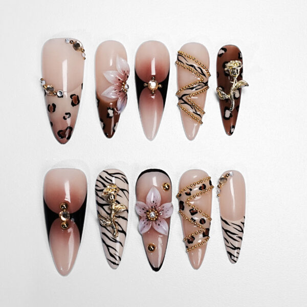 “Jungle Luxe”美甲套装包括豹纹、斑马纹、3D花朵、金玫瑰装饰等图案的美甲,以及这些元素与水钻和金属链的组合,全部采用棕色和裸色等大地色调。