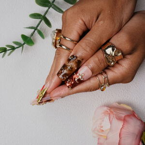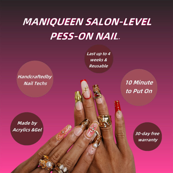 The “Opulent” nail art set features nail pieces with a diverse color palette, including soft pink, deep brown, red, and gold. Adornments are lavish and eye – catching, such as cross – shaped embellishments encrusted with diamonds, heart – shaped decorations with gem – like centers, golden leaf – like motifs, and pearls. There are also leopard – print patterns, combined with small golden beads and other sparkling rhinestones, creating a rich and luxurious visual effect.