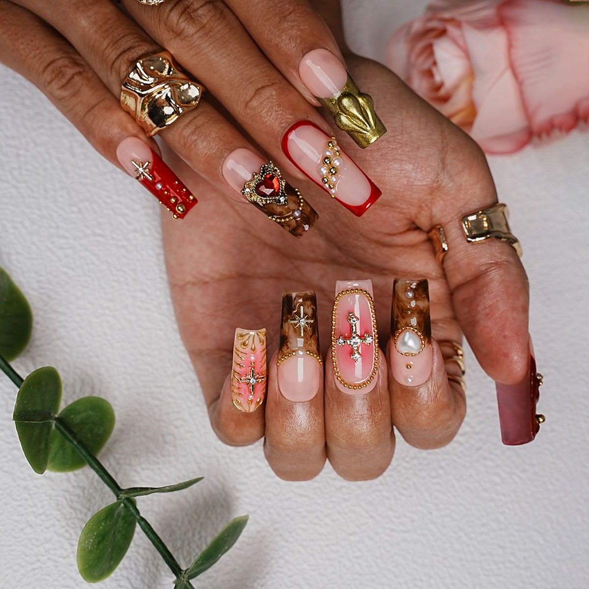 The “Opulent” nail art set features nail pieces with a diverse color palette, including soft pink, deep brown, red, and gold. Adornments are lavish and eye – catching, such as cross – shaped embellishments encrusted with diamonds, heart – shaped decorations with gem – like centers, golden leaf – like motifs, and pearls. There are also leopard – print patterns, combined with small golden beads and other sparkling rhinestones, creating a rich and luxurious visual effect.