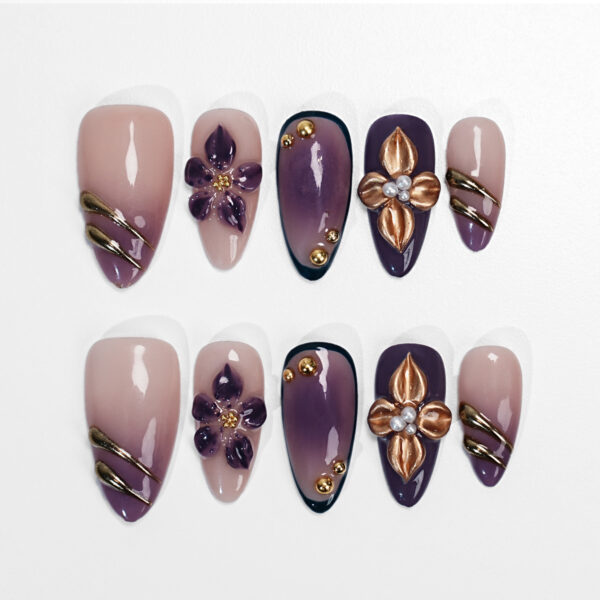 The “Royal Viol” nail art set features nail pieces with a gradient color scheme that transitions smoothly from light nude – pink to deep purple. Adornments include exquisitely crafted 3D purple flowers, some with golden centers, adding a touch of luxury. There are also metallic gold – toned curved strips and small golden beads, as well as elegant gold – colored floral embellishments adorned with pearls, enhancing the overall noble and refined feel of the nail designs.