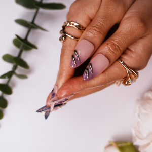 “Royal Viol” nail art elegantly combines a sophisticated nude – pink to purple gradient with opulent decorative elements like 3D flowers, metallic accents, and pearl – adorned motifs. It creates a regal and refined look, perfect for those seeking a touch of luxury and elegance for their nails.