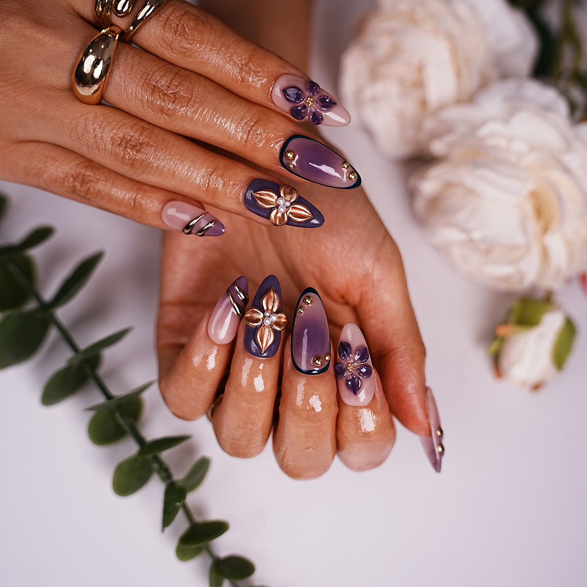The “Royal Viol” nail art set features nail pieces with a gradient color scheme that transitions smoothly from light nude – pink to deep purple. Adornments include exquisitely crafted 3D purple flowers, some with golden centers, adding a touch of luxury. There are also metallic gold – toned curved strips and small golden beads, as well as elegant gold – colored floral embellishments adorned with pearls, enhancing the overall noble and refined feel of the nail designs.