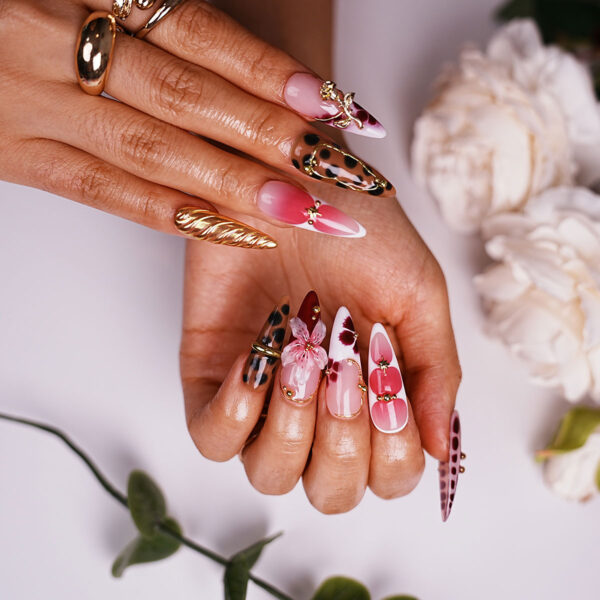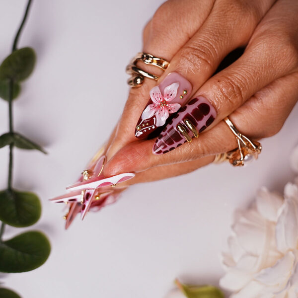 The “Safari Glitz” nail art set features nail pieces with a color palette that includes soft pinks, deep browns, and purples. It incorporates wild – inspired patterns such as leopard spots and giraffe – like prints. Decorative elements consist of delicate 3D pink flowers, golden floral motifs, small gold beads, and golden metal – like rings and twisted strips. These details add a touch of glamour and luxury to the wild – themed nail designs.