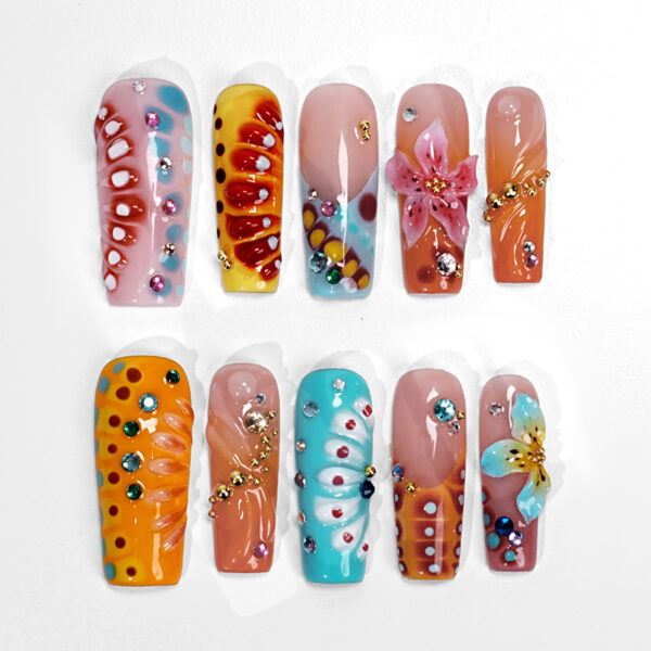 The “Tropic Glitz” nail art set showcases a vibrant array of nail pieces. The base colors range from soft pastels like light pink and peach to bold hues such as bright orange and turquoise. Each nail features unique designs, including 3D floral embellishments in pink and blue, playful polka – dot patterns in various colors, and sparkling rhinestones in different shapes and colors scattered across the nails. There are also some flowing, wave – like patterns that add a sense of movement to the overall look.