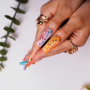 + Free Shipping“Tropic Glitz” nail art captures the essence of tropical vibrancy, blending bright and pastel colors with eye – catching 3D floral motifs, colorful polka dots, and sparkling rhinestones. It creates a fun, glamorous, and distinctly tropical look that’s perfect for making a bold fashion statement.