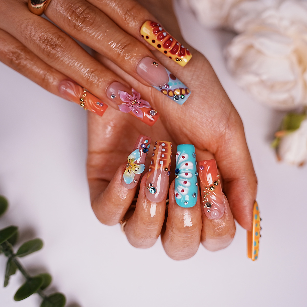 The “Tropic Glitz” nail art set showcases a vibrant array of nail pieces. The base colors range from soft pastels like light pink and peach to bold hues such as bright orange and turquoise. Each nail features unique designs, including 3D floral embellishments in pink and blue, playful polka – dot patterns in various colors, and sparkling rhinestones in different shapes and colors scattered across the nails. There are also some flowing, wave – like patterns that add a sense of movement to the overall look.