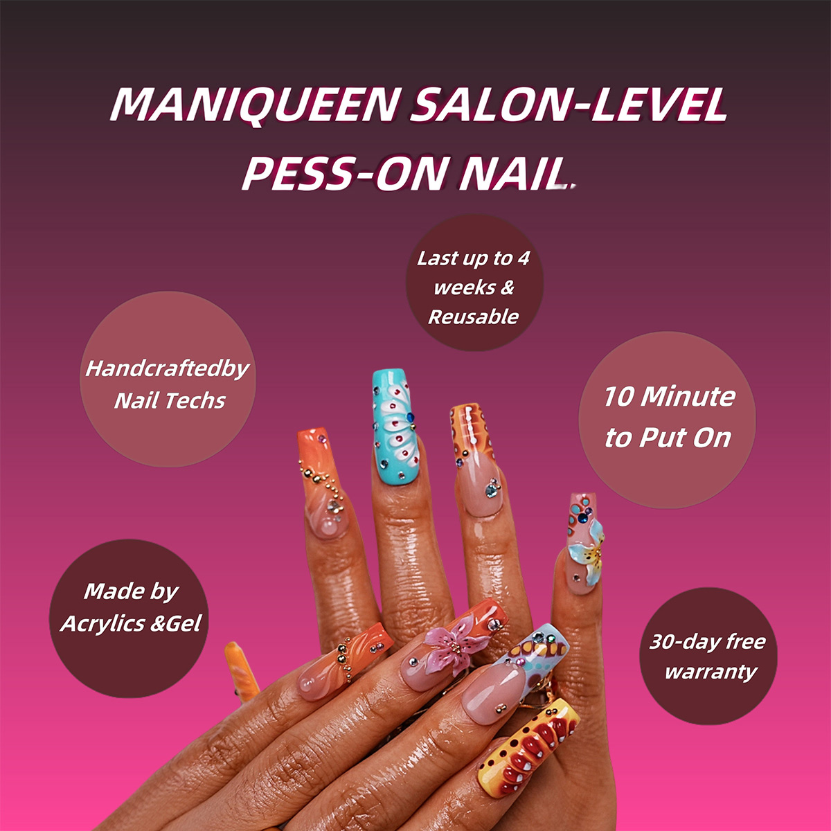 + Free Shipping“Tropic Glitz” nail art captures the essence of tropical vibrancy, blending bright and pastel colors with eye – catching 3D floral motifs, colorful polka dots, and sparkling rhinestones. It creates a fun, glamorous, and distinctly tropical look that’s perfect for making a bold fashion statement.